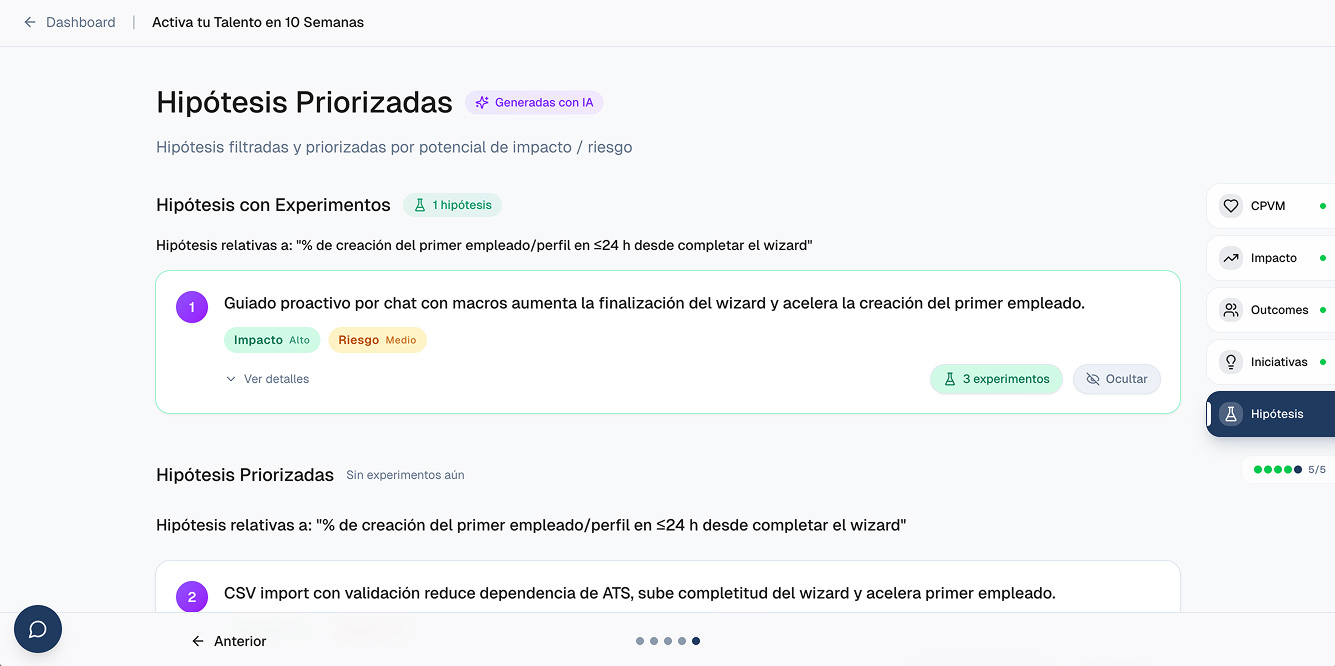 Pero donde la herramienta marca la mayor diferencia es al final del recorrido: te ayuda a identificar cuáles son las hipótesis más prioritarias desde el punto de vista del valor que generan y del riesgo que implican. Y para cada hipótesis, te ayuda a diseñar experimentos con rigor metodológico.